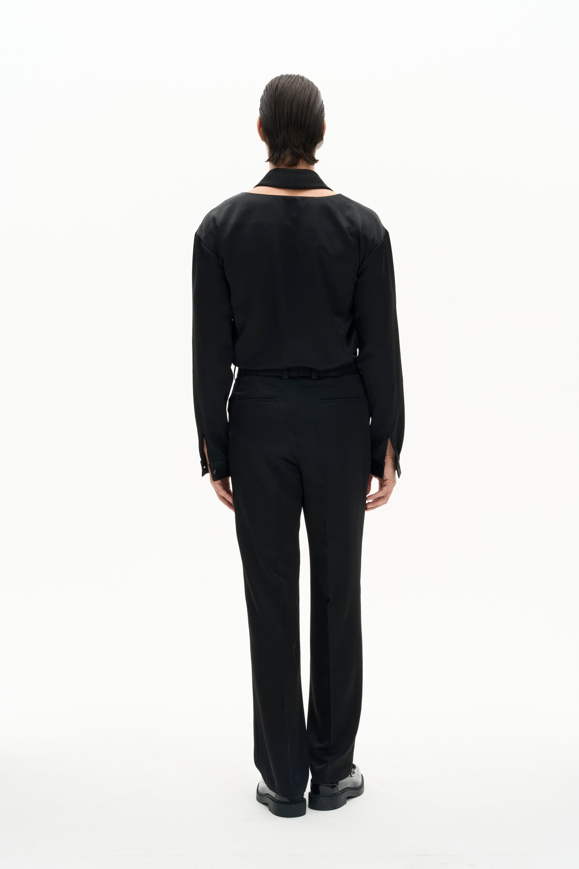 The Mirage Wrap Shirt embodies sophisticated evening sensuality. Crafted from 100% wool satin, it features a deep overlapping neckline and strategic cut-outs, subtly revealing glimpses of skin while maintaining an elegant silhouette.