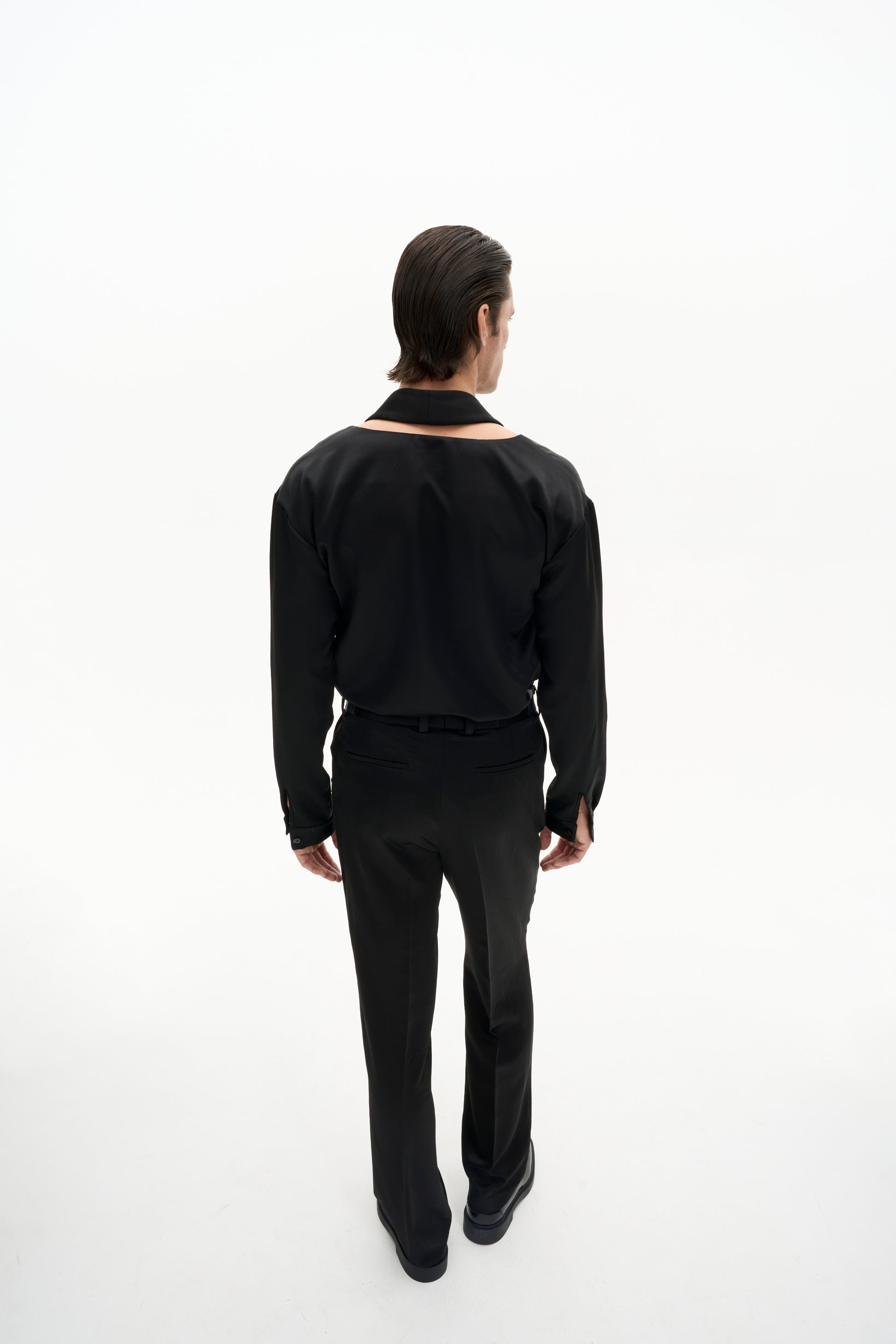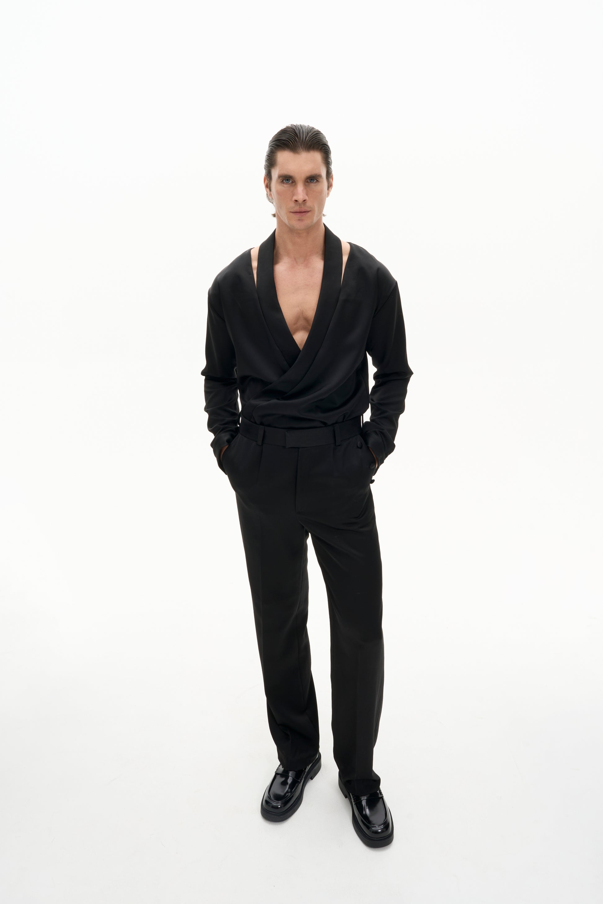 Designed for fluidity and comfort, the fitted shirt moves effortlessly with the body. Perfectly paired with matching evening trousers, the Mirage Wrap Shirt is ideal for exclusive night-time events, parties, or high-end evening occasions.