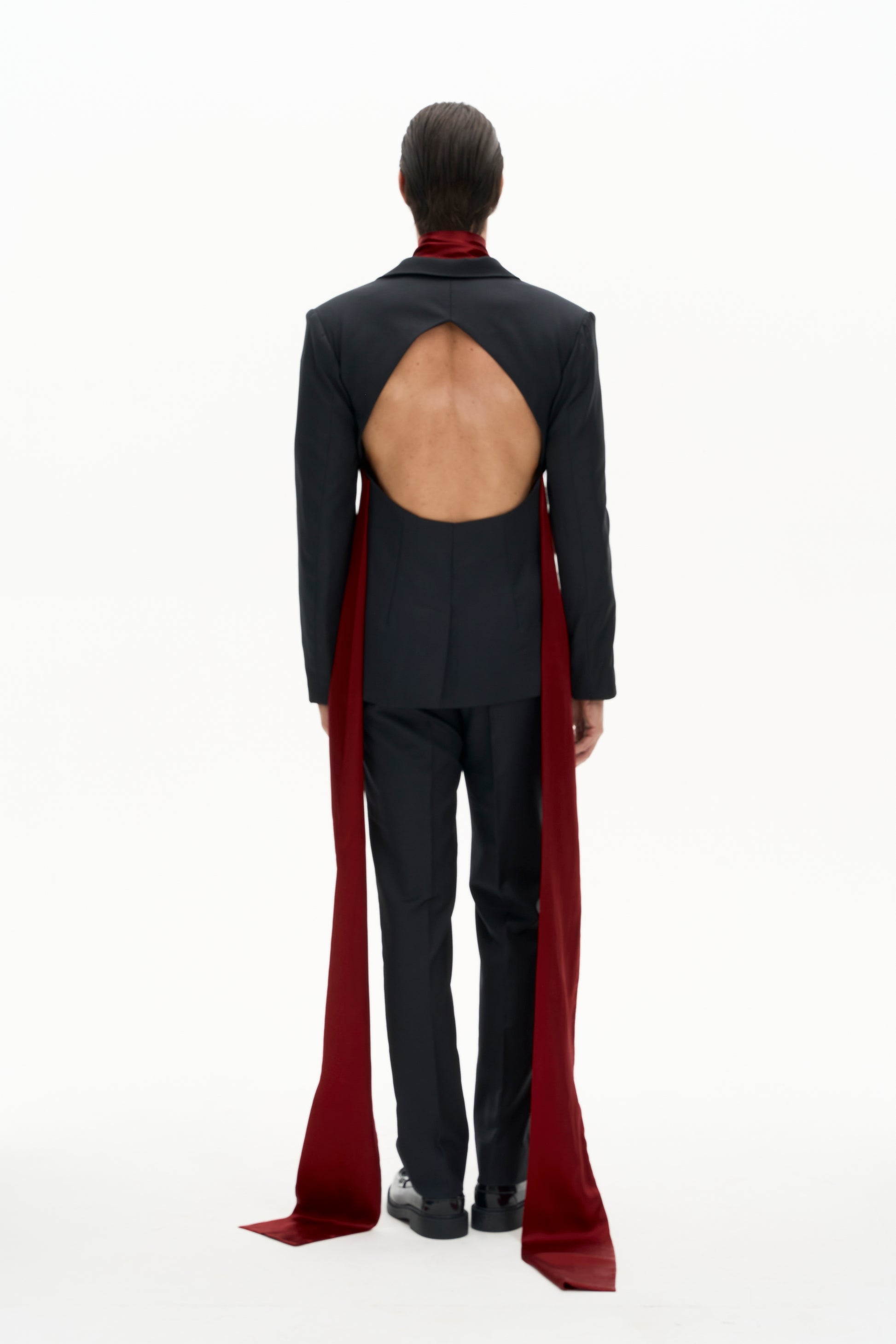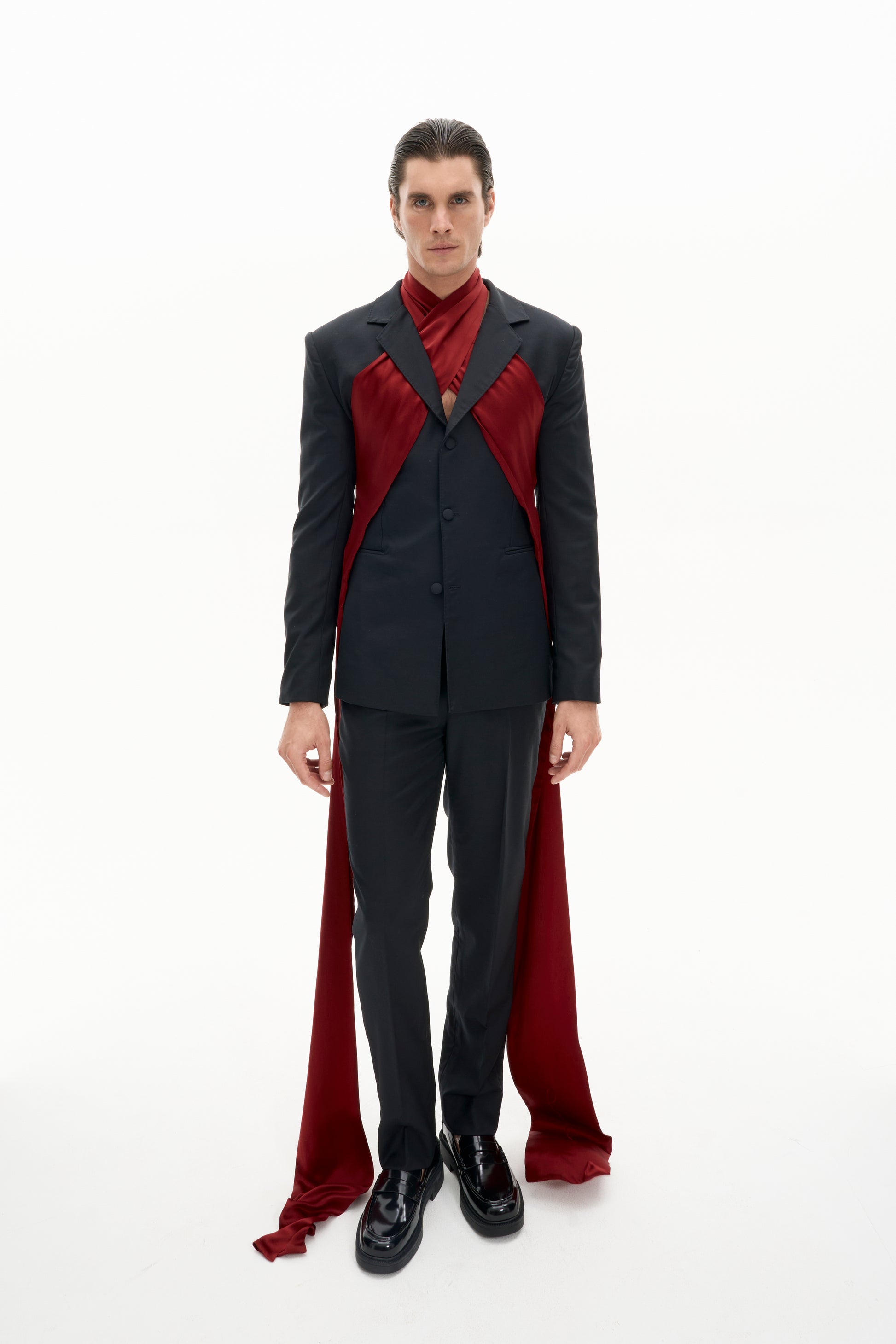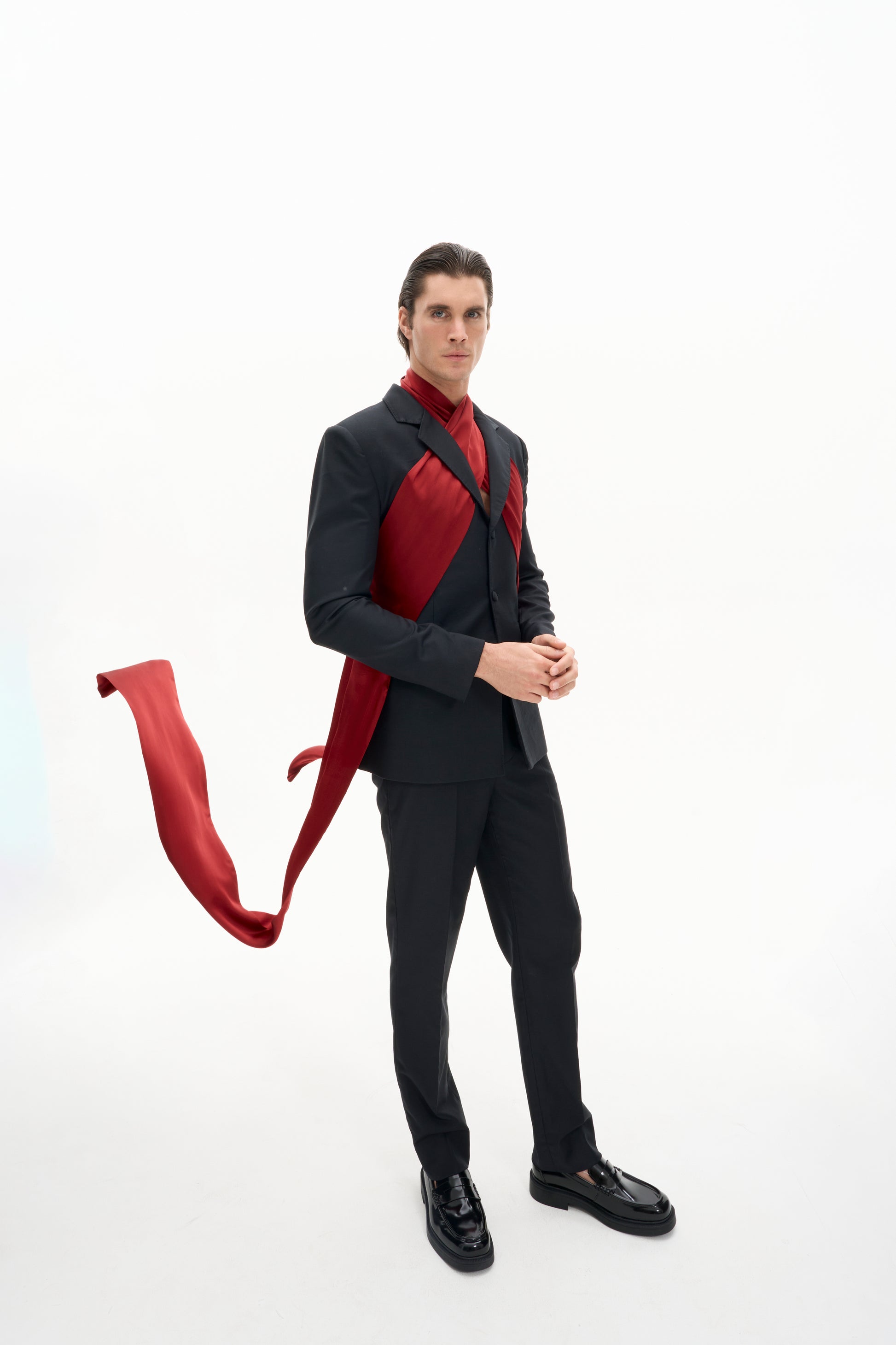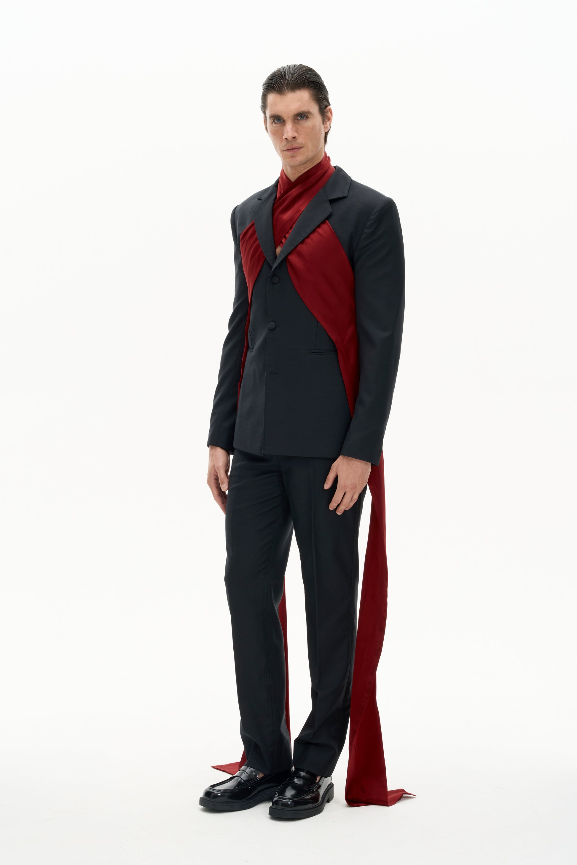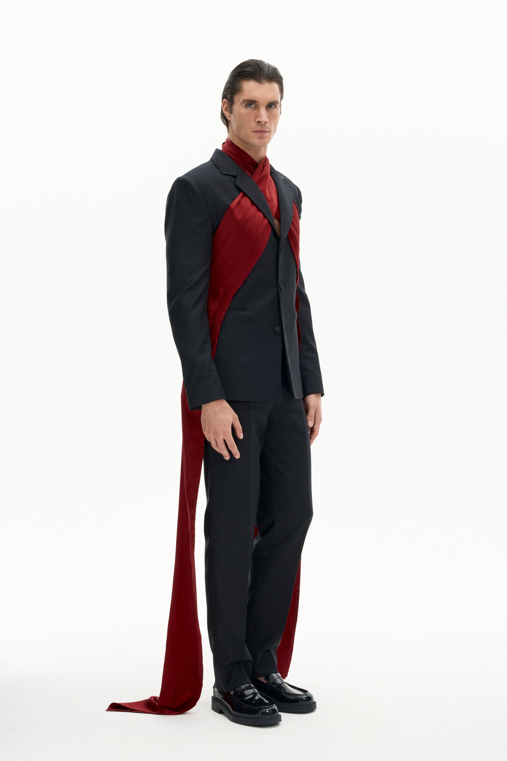 A distinctive highlight of the jacket is the under-collar design, where finely crafted seam lines allow a mulberry silk ribbon to be threaded around the neckline, adding a personalized, ceremonial touch to the ensemble. The combination of precision tailoring, luxurious materials, and sophisticated detailing ensures the Imperial Suite commands attention at any high-profile event.