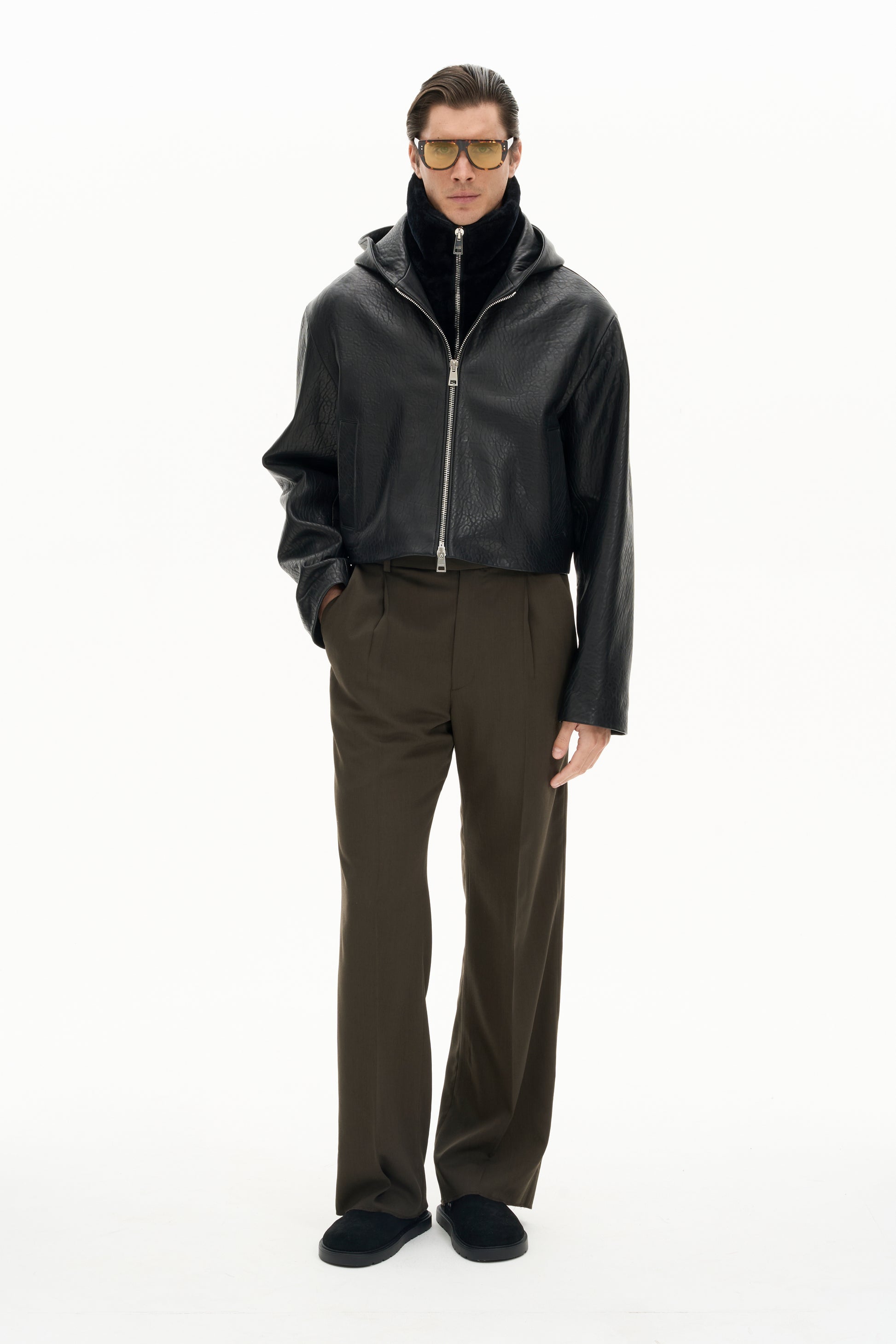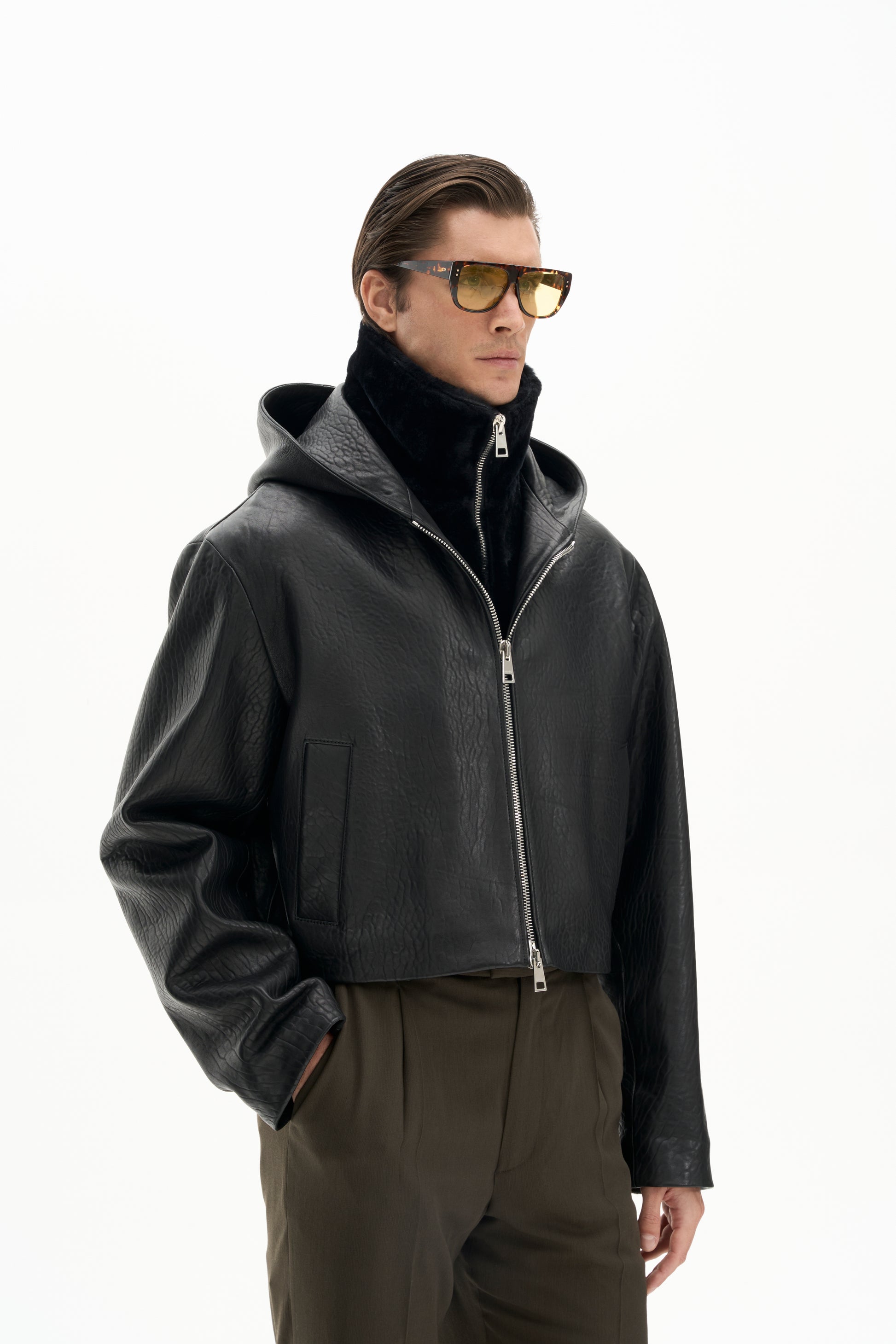 The Soho Leather Jacket brings urban sophistication to winter outerwear. Crafted from premium mouflon leather, this boxy-fit, hooded crop jacket features a luxurious silk lining and a removable shearling front panel with high collar, allowing you to wear it with or without the plush wool detail.