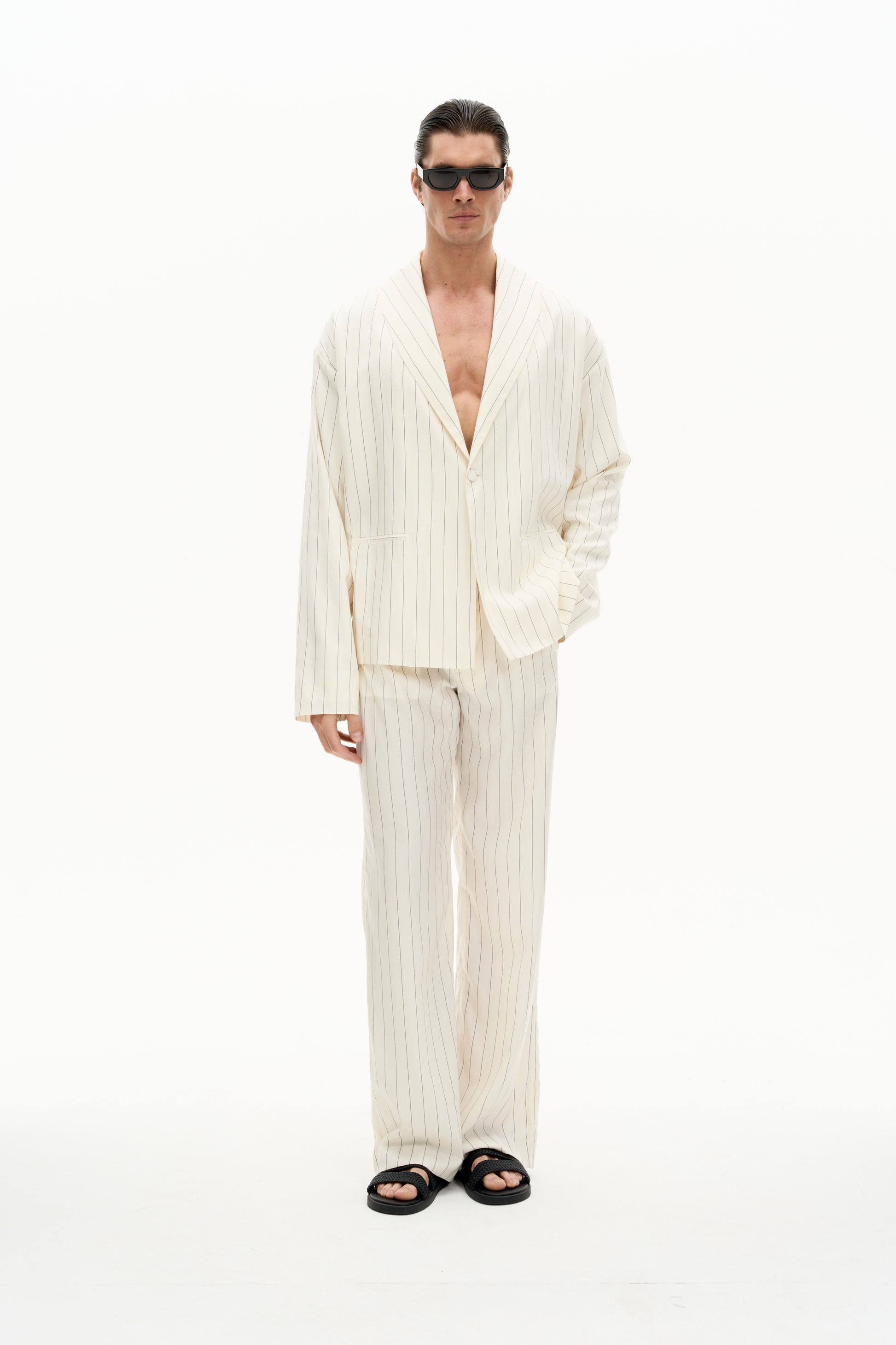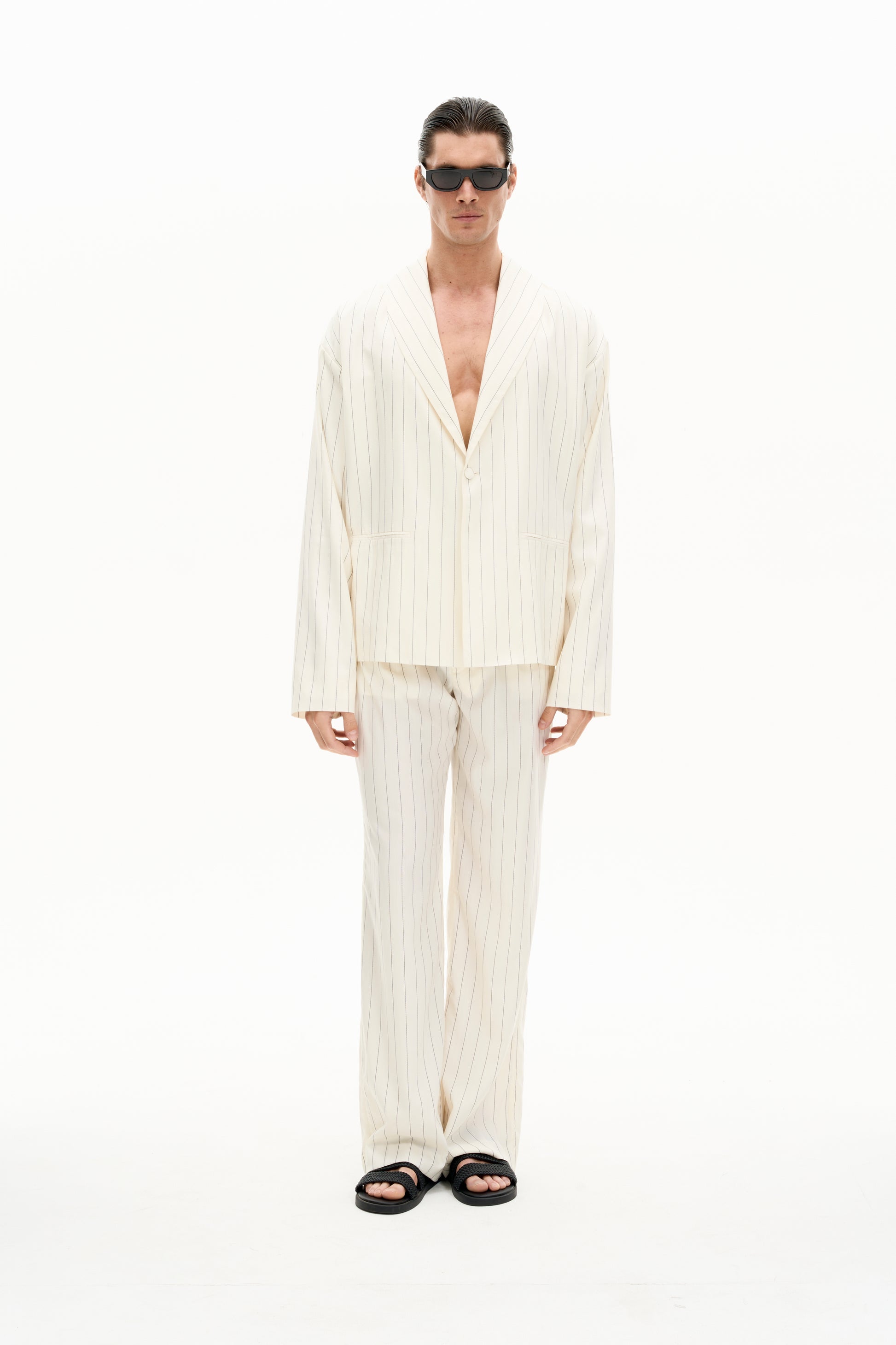 Crafted from Super 140 wool with a subtle white base and fine black stripes interwoven with metallic threads, this pajama-inspired set drapes effortlessly for a soft, fluid silhouette.