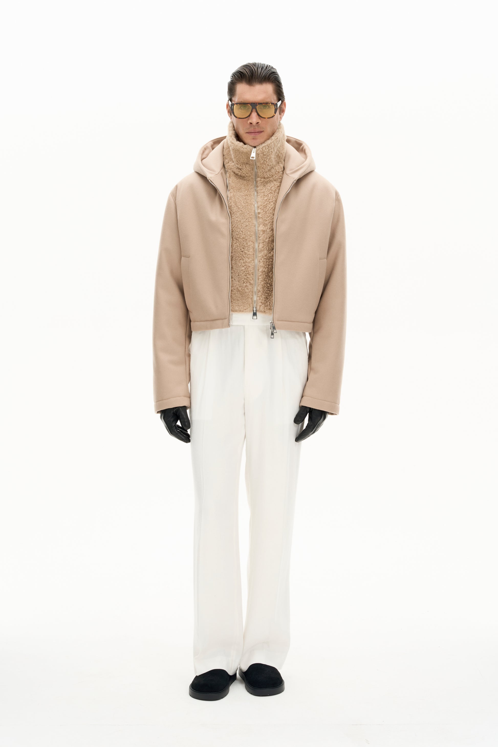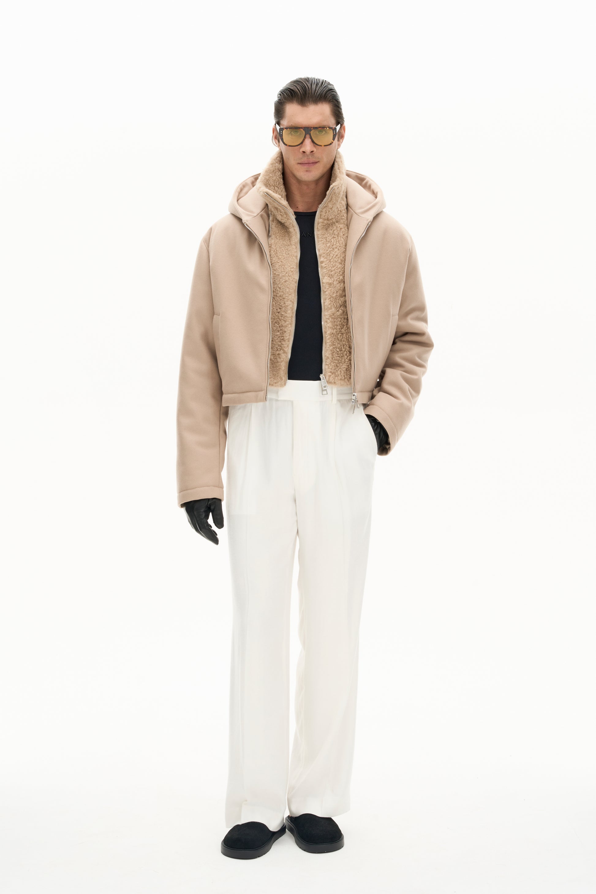 A signature highlight is the removable shearling front panel with a high collar, allowing you to wear the coat with or without the luxurious wool detail. Finished with metal AANRO-branded zippers, the coat balances refined tailoring with contemporary urban edge.