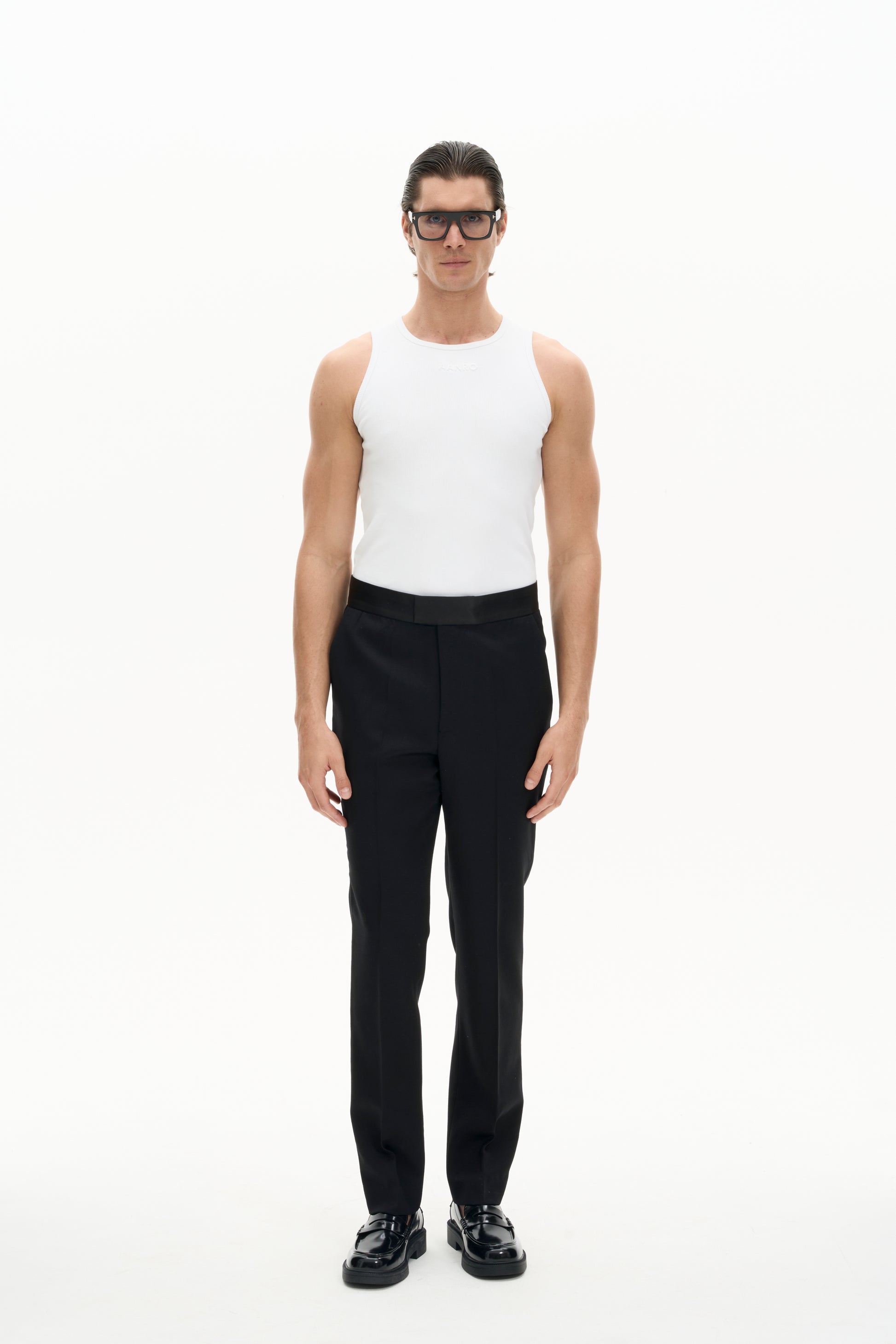 Crafted from 100% fine wool, the Mirage Tuxedo pant features a satin waistband inspired by classic tuxedo design, adding a subtle yet refined touch.