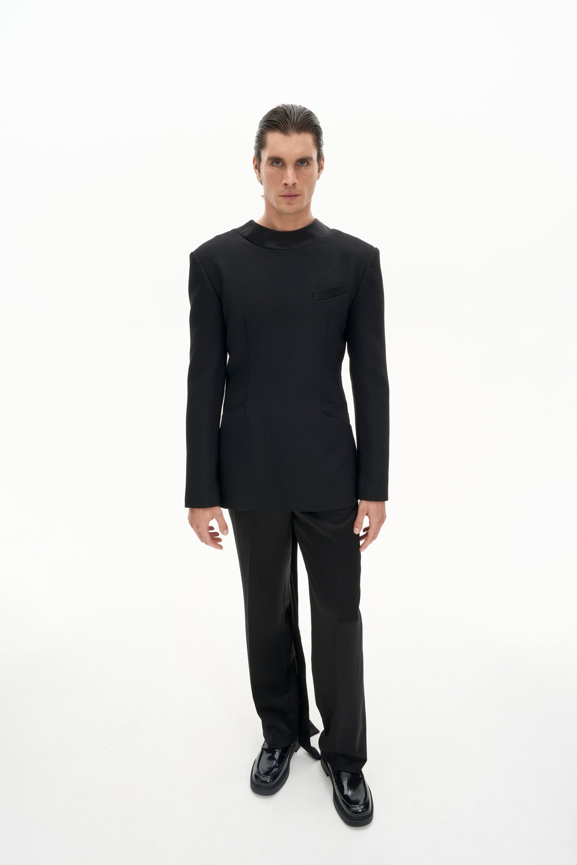 Paired with matching wool-satin trousers, the Mirage Tuxedo captures the essence of modern luxury — sleek, unexpected, and designed for those unafraid to stand out.