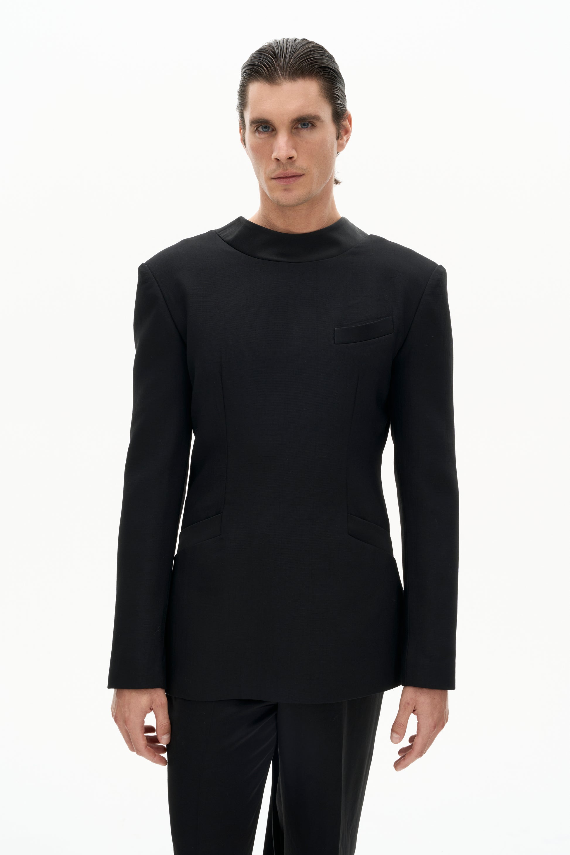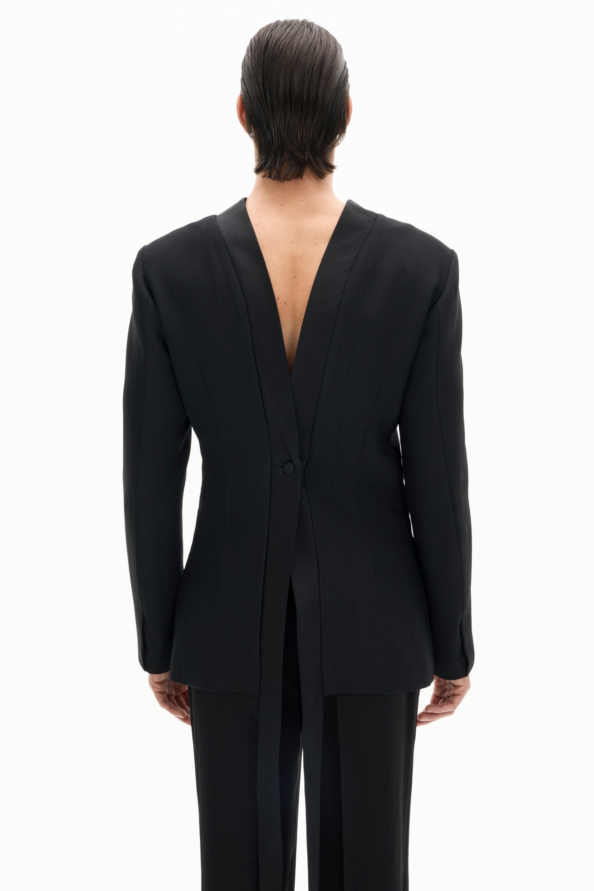 Constructed from 100% fine wool, the Mirage Tuxedo features a reversed jacket construction, where the closure sits elegantly at the back — offering a daring twist on traditional eveningwear. Satin patch pockets at the front and a silk-satin belt that ties at the back create a refined yet provocative silhouette.